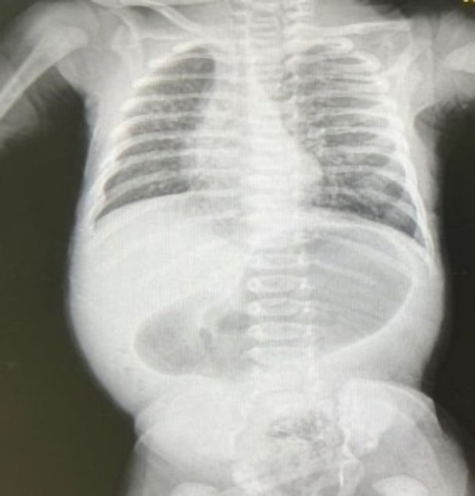 An abdominal X-ray demonstrated a single large bubble (Fig. 2), prompting an urgent surgical consultation. Laboratory results confirmed severe dehydration, with elevated creatinine and urea levels, coagulopathy characterized by a significantly elevated international normalized ratio (INR), and elevated lactate levels with a metabolic alkalosis on venous blood gas, all suggestive of hypoperfusion and systemic compromise.