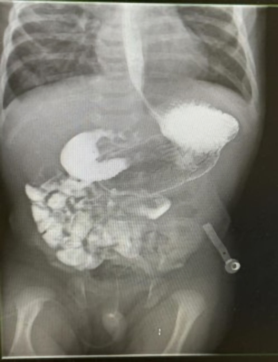After the patient’s condition stabilized, the surgery team conducted an UGI study (Fig. 3), which was suboptimal due to the unavailability of early oblique images to assess the duodenum and duodenojejunal junction orientation. Nevertheless, the study revealed dilatation of the stomach and duodenal “C” loop, with possible narrowing at the duodenum or pylorus and jejunal loops positioned on the right, suggestive of malrotation.