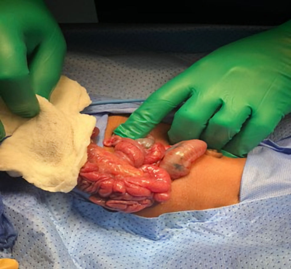 ![]() Click for large image | Figure 4. Intraoperatively, a midgut malrotation without volvulus was identified and the bowel was viable with no signs of necrosis. |