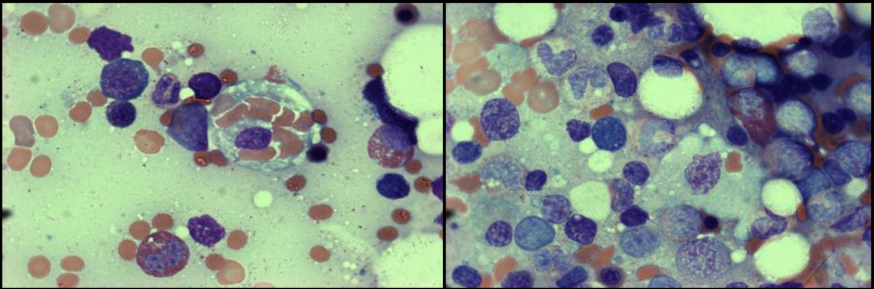 ![]() Click for large image | Figure 2. Wright-Giemsa stain at × 200 (left) and × 1,000 (right) magnification showing a single histiocyte performing hemophagocytosis with ingestion of mature RBCs. RBCs: red blood cells. |