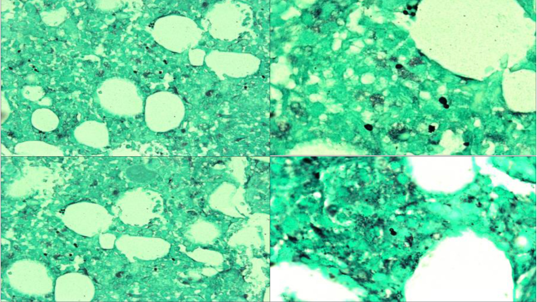 ![]() Click for large image | Figure 3. GMS staining at × 40 (upper left, lower left) and × 100 (upper right, lower right) showing numerous extracellular small narrow-based yeast cells consistent with disseminated histoplasmosis. GMS: Grocott-Gomori methenamine silver. |