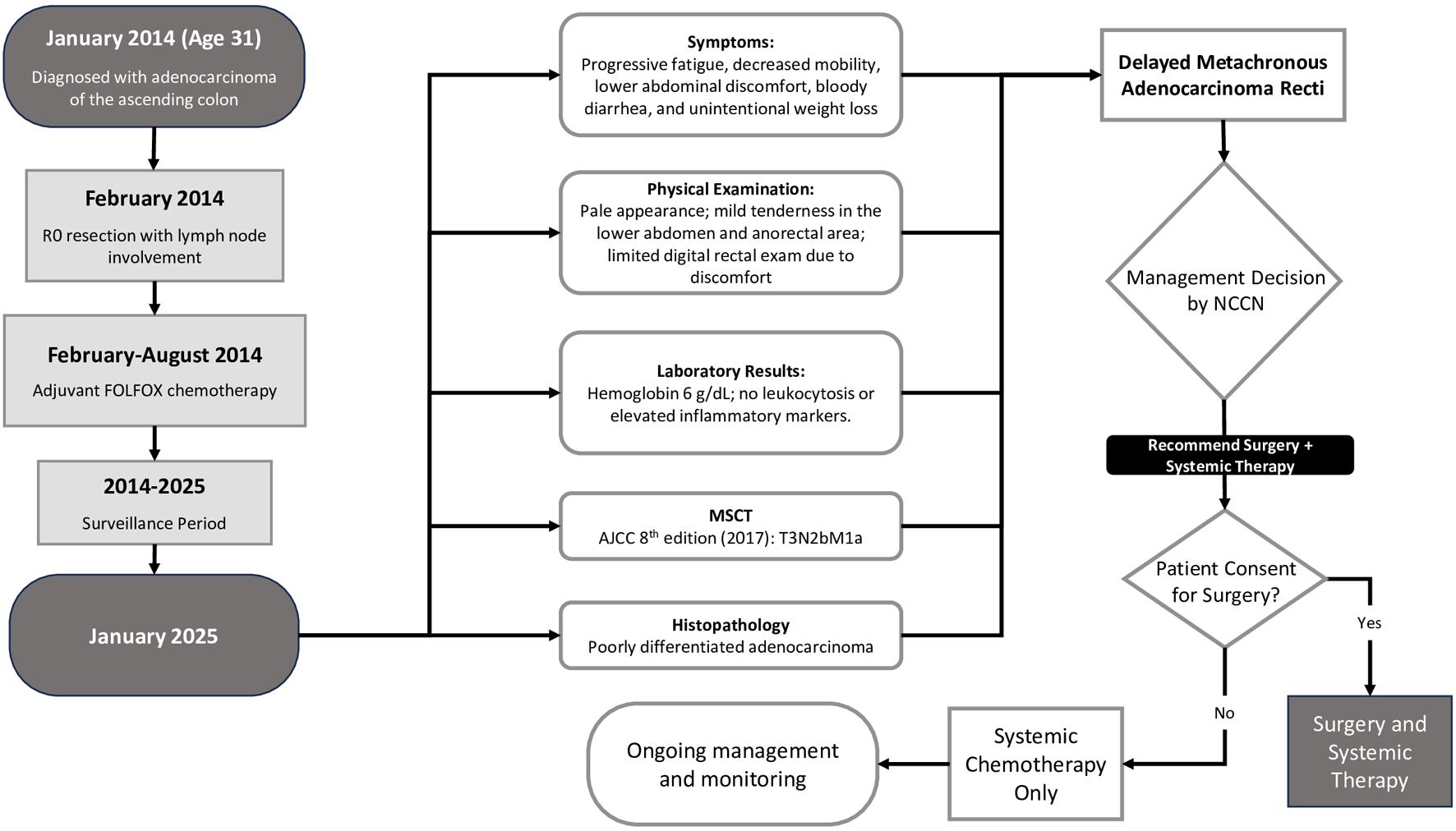 The patient was initially managed appropriately with R0 surgical resection and 6 months of adjuvant FOLFOX chemotherapy, consistent with NCCN guidelines for stage III CRC [6]. He remained recurrence-free for 11 years, until presenting with a symptomatic rectal mass. Clinical staging indicated T3N2bM1a disease potentially resectable metastasis limited to one site which still fell under the category of potentially curable stage IVa CRC [7]. However, the patient declined further surgery, due to concerns about invasiveness, perceived surgical risk, or psychosocial barriers. As a result, management was limited to systemic chemotherapy, reducing the overall potential for curative intent.