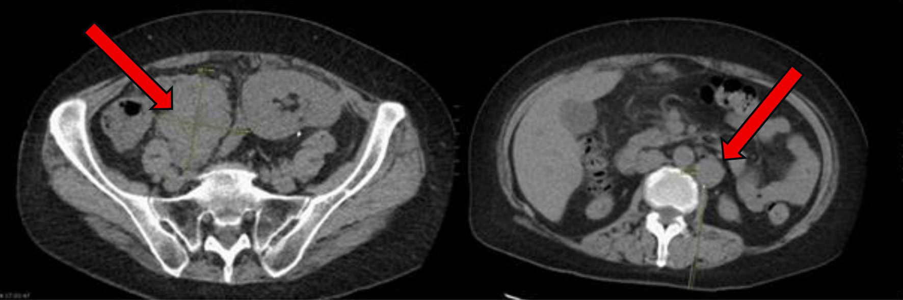 ![]() Click for large image | Figure 1. At time of initial presentation, CT abdomen and pelvis showing increase in size of the abdominal and pelvic lymph nodes (arrows) suspicious for post-transplant lymphoproliferative disorder. CT: computed tomography. |