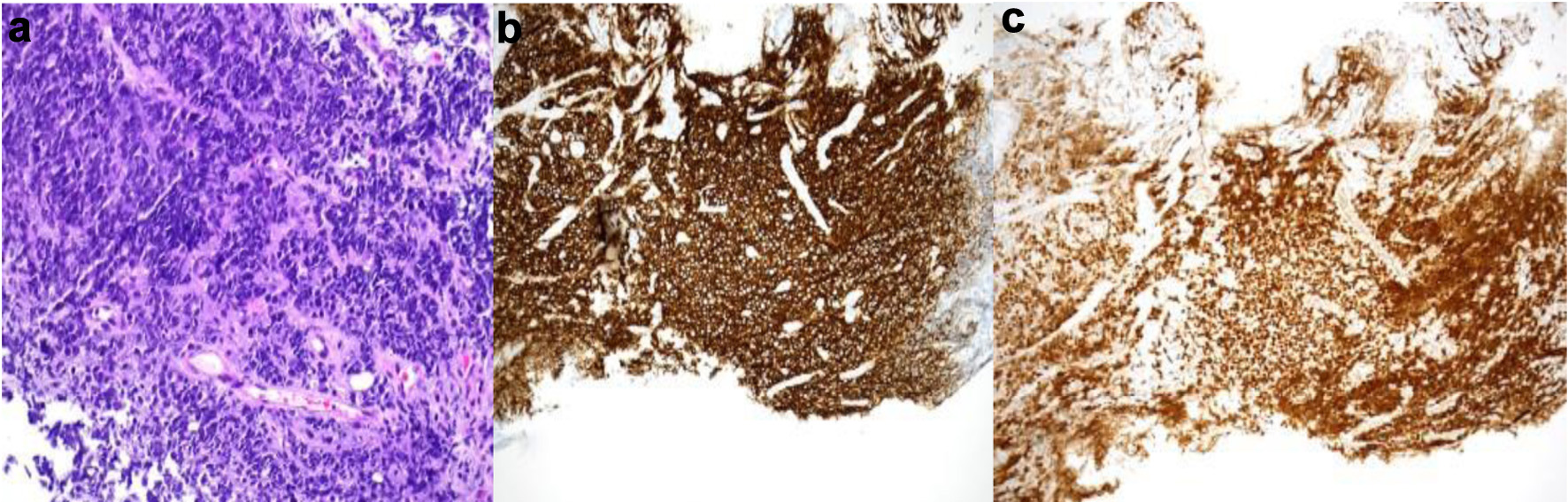 ![]() Click for large image | Figure 2. Gastric biopsy showing sheets of small round blue tumor cells (a, H&E, × 200) that stained diffusely positive with B-cell markers CD20 (b, CD20 immunohistochemistry, × 100) and PAX5 (c, PAX5 immunohistochemistry, × 100). H&E: hematoxylin and eosin. |