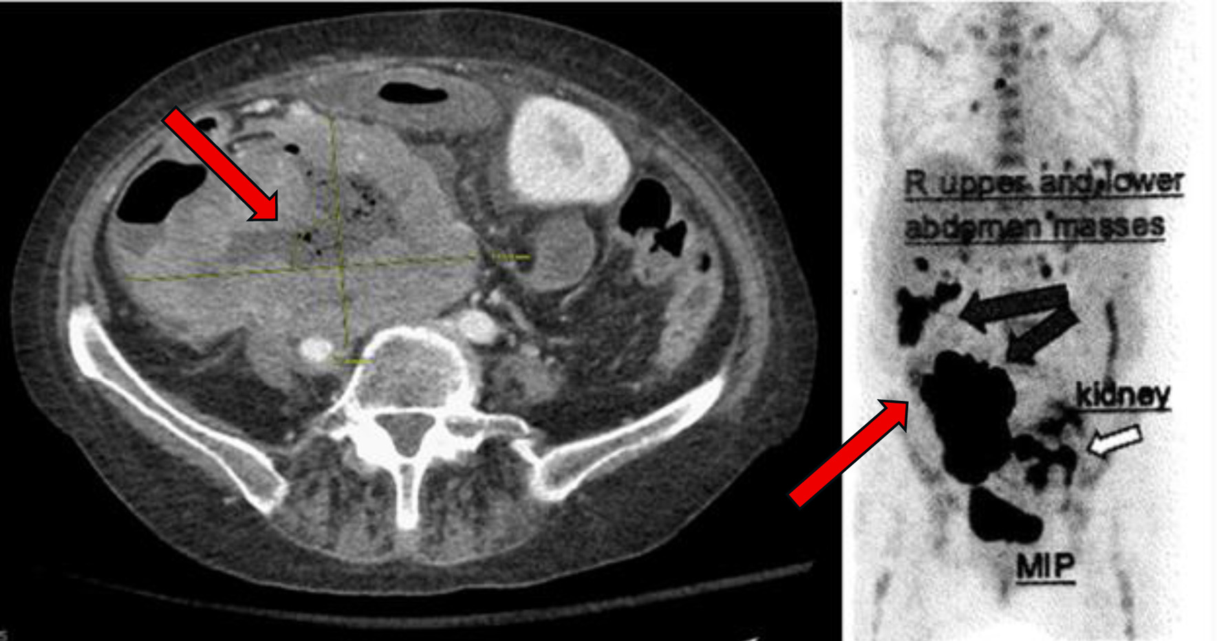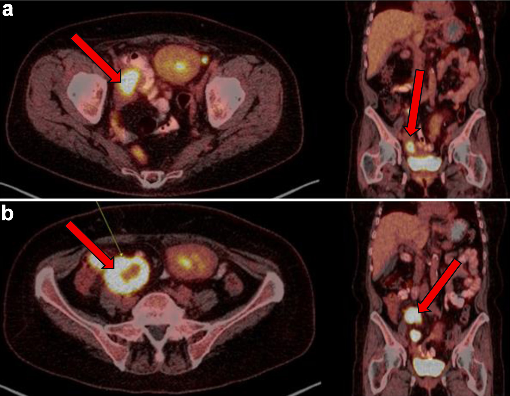 ![]() Click for large image | Figure 3. (a) PET showing metabolic activity of right sided pelvic lymph nodes/nodal masses (arrows) at 3 months from initial presentation. (b) PET conducted 4 months after initial presentation with diffuse terminal ileum/ascending colon thickened wall uptake and increase in size and metabolic activity of right-sided pelvic lymph nodes/nodal masses (arrows), consistent with persistent lymphoma. PET: positron emission tomography. |
