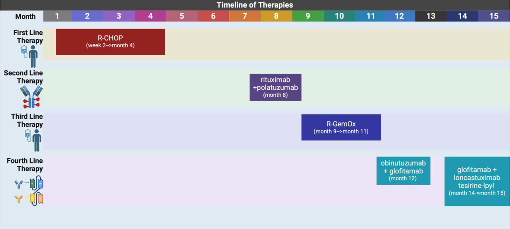 She received her first dose of glofitamab and loncastuximab tesirine-lpyl nearly 15 months after her initial diagnosis. She was admitted to the hospital a week later due to abdominal pain, fever, and chills with imaging at the time that did indicate her disease had progressed. However, after having extensive conversations with the medical team and patient’s family, the patient expressed desire to stop aggressive treatment and elected to transition to hospice care. At that time, she reported symptomatic relief with an effective pain regimen and was at peace with her decision to forgo further treatment. The palliative care team was involved in supporting the patient’s decision. Hospice services were continued, and she remained under close observation with continued emotional and pain management support. Table 1 describes in detail this patient’s complicated clinical course and treatment history. Figure 5 is a visual timeline of the therapies used to treat this case.