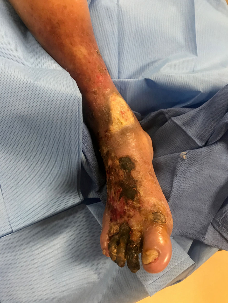 ![]() Click for large image | Figure 1. Right foot at initial presentation with new gangrene involving the third and fourth toes, a new wound on the dorsum of the foot. |