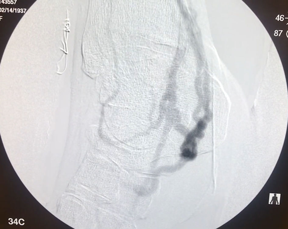 An 80-year-old woman with significant medical comorbidities of coronary artery disease, hypertension, poorly controlled diabetes mellitus, hyperlipidemia, and an over 10 year, one-pack-per-day smoking history, presented to a vascular surgeon with CLTI and dry gangrene of the second toe, who underwent planned common femoral artery (CFA) to posterior tibial artery (PTA) bypass surgery for revascularization. Immediately after surgery, the patient’s pain increased. She developed additional gangrene of her third and fourth toes, a new wound on the dorsum of her foot, and a new wound at the anastomosis site of the bypass (Fig. 1). The patient was offered a below-knee amputation after 2 months, with worsening symptoms. The patient then presented for a second opinion. Angiography demonstrated that the graft was inadvertently anastomosed to the peroneal vein near the foot (Fig. 2). Two additional vascular surgeons both deemed the patient at too high a risk for bypass revision due to her comorbid medical conditions and lack of additional venous conduit. Due to the patient’s deteriorating condition and comorbidities, percutaneous revision of the bypass was offered.