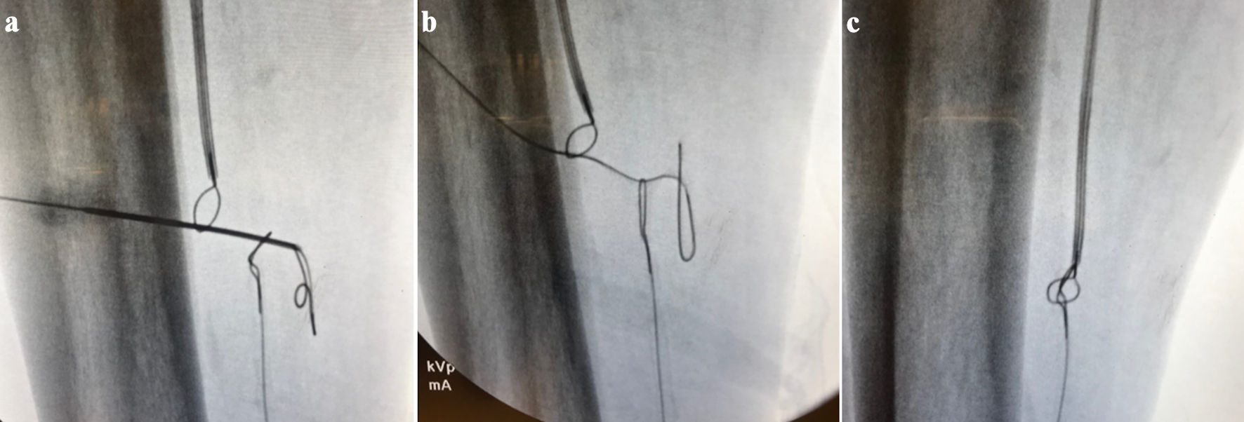 ![]() Click for large image | Figure 3. (a) Using double gunsight technique, a micropuncture needle was placed through the skin at the lower leg and through both snares. (b) Command 0.018-in floppy wire inserted in the micropuncture needle, and the needle removed. (c) Floppy wire snared from both ends establishing a tract. |