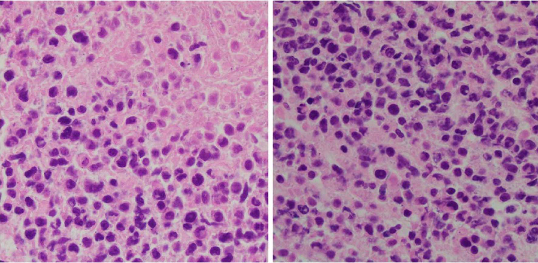 ![]() Click for large image | Figure 1. Tonsil mass biopsy histology: high-grade lymphoid neoplasm with necrosis (H&E, × 40). H&E: hematoxylin and eosin. |