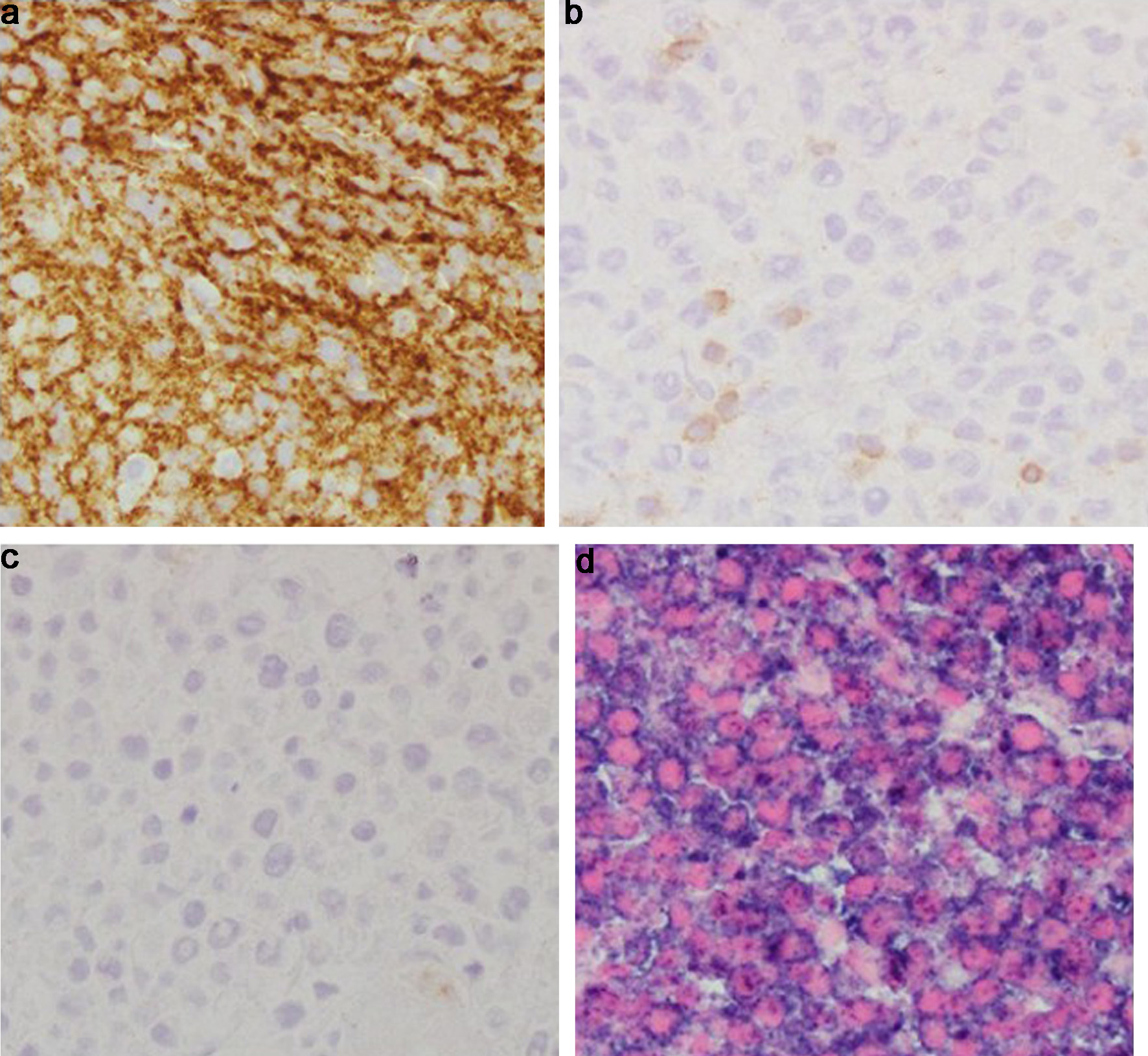 ![]() Click for large image | Figure 2. Tonsil mass biopsy histology. (a) CD 20 immunostain (× 40): positive in the abnormal infiltrate, confirming B-cell lineage. (b) CD3 immunostain (× 40): negative in the neoplastic B cells. Admixed CD3+ small T cells. (c) CD10 immunostain (× 40): negative in the neoplastic B cells. (d) EBER-ISH (× 40): positive in the neoplastic B cells. EBER-ISH: Epstein-Barr virus-encoded small RNA in situ hybridization. |
