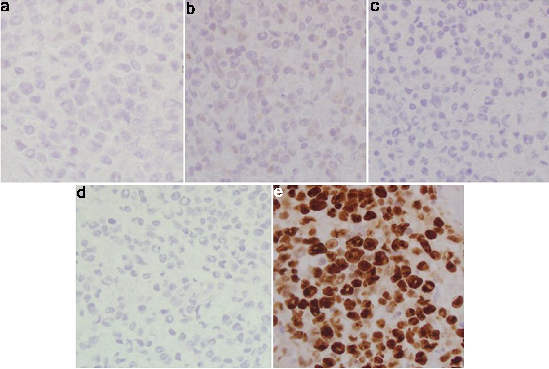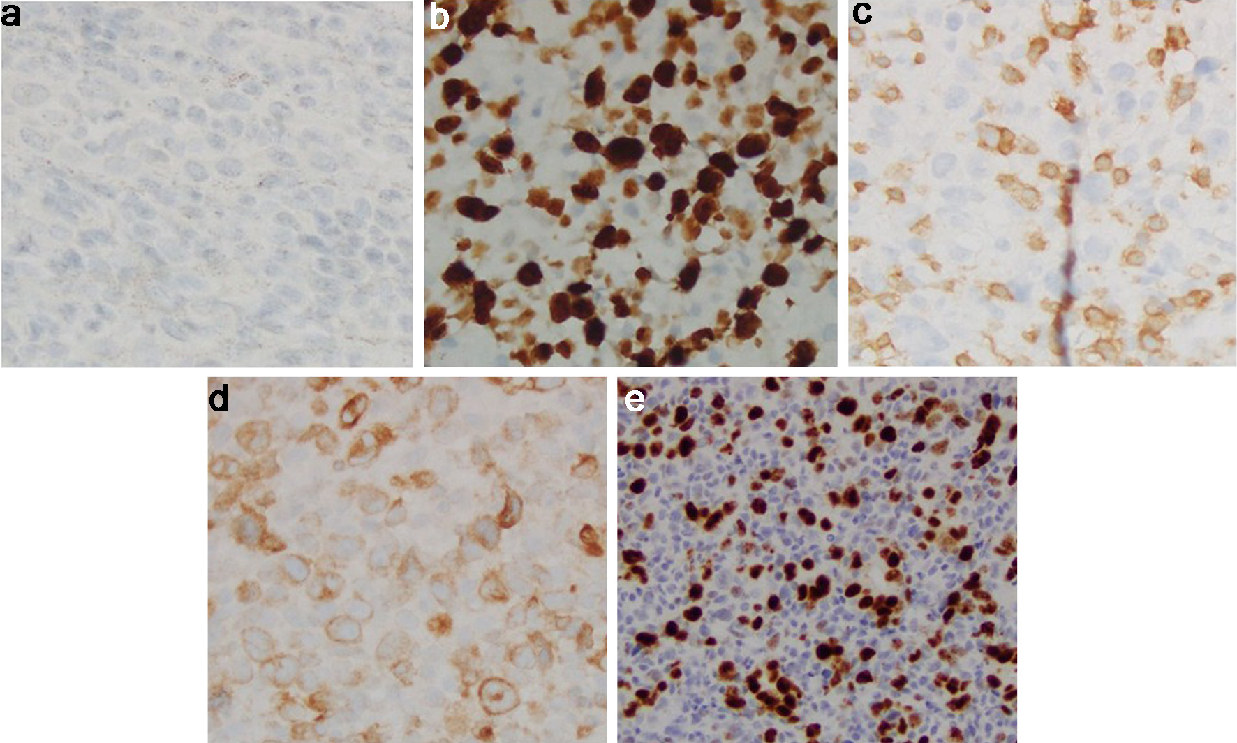 ![]() Click for large image | Figure 3. Tonsil mass biopsy histology. (a) BCL6 immunostain (× 40): negative in the neoplastic B cells. (b) BCL2 immunostain (× 40): negative in the neoplastic B cells. (c) C-MYC immunostain (× 40): negative in the neoplastic B cells. (d) MUM1 immunostain (× 40): negative in the neoplastic B cells. (e) Ki-67 immunostain (× 40): elevated proliferative index in the large cell infiltrate. BCL2: B-cell lymphoma 2; BCL6: B-cell lymphoma 6; MUM-1: multiple myeloma oncogene 1. |