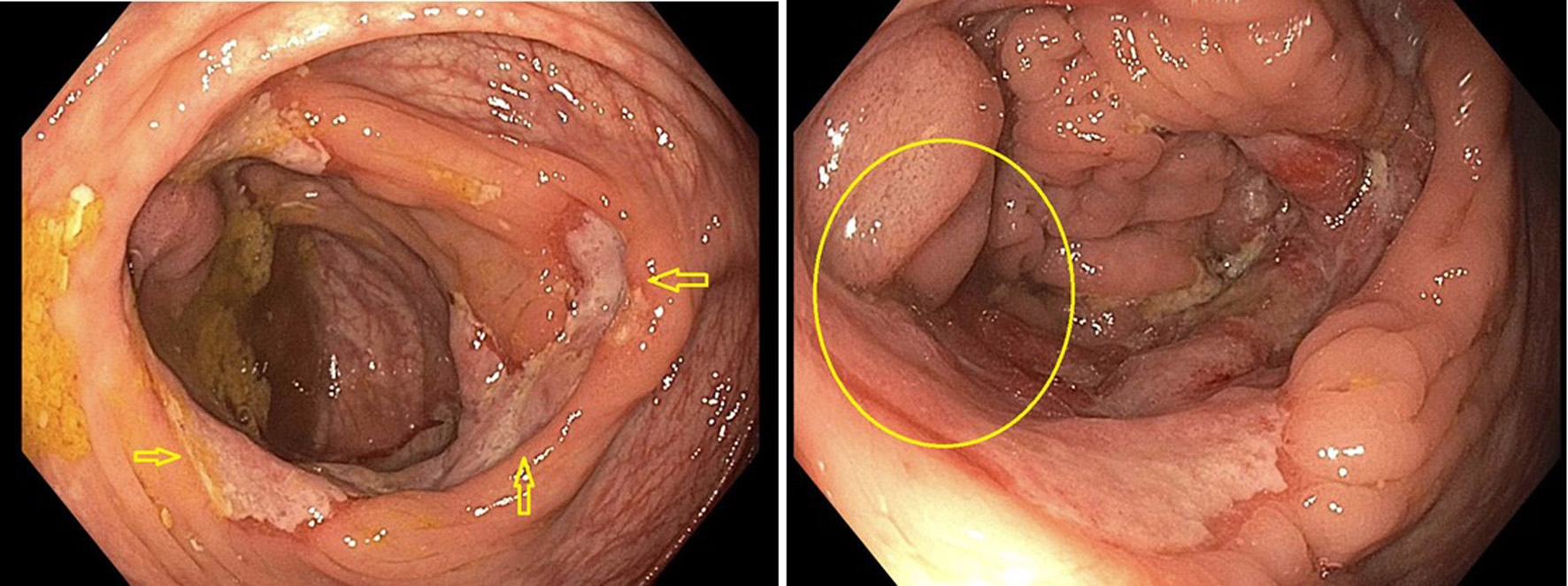 ![]() Click for large image | Figure 4. Solitary 15 mm ulcer in cecum on colonoscopy. Arrows indicate the extent and dimensions of ulcer. Circle indicates distortion of ileocecal valve from the ulcer. |