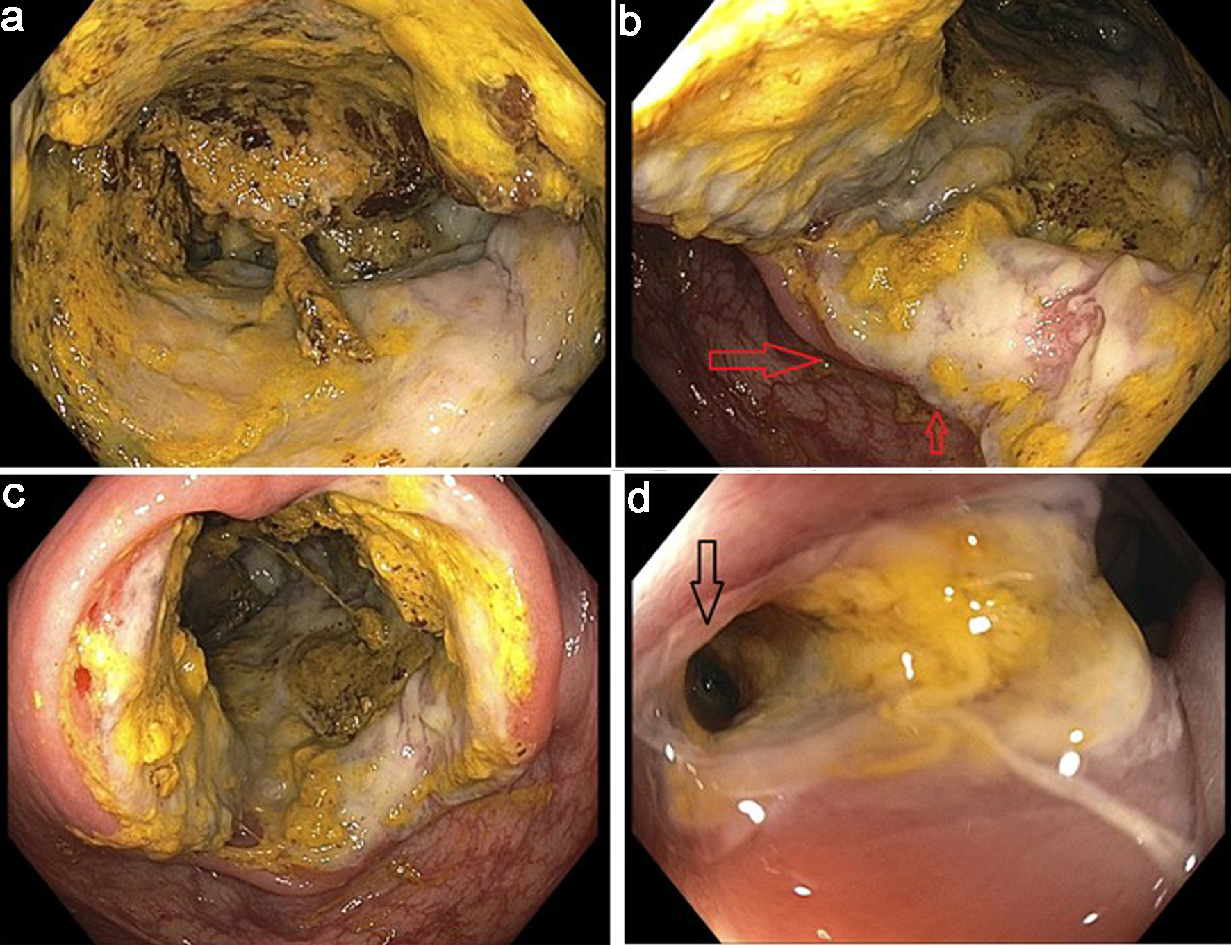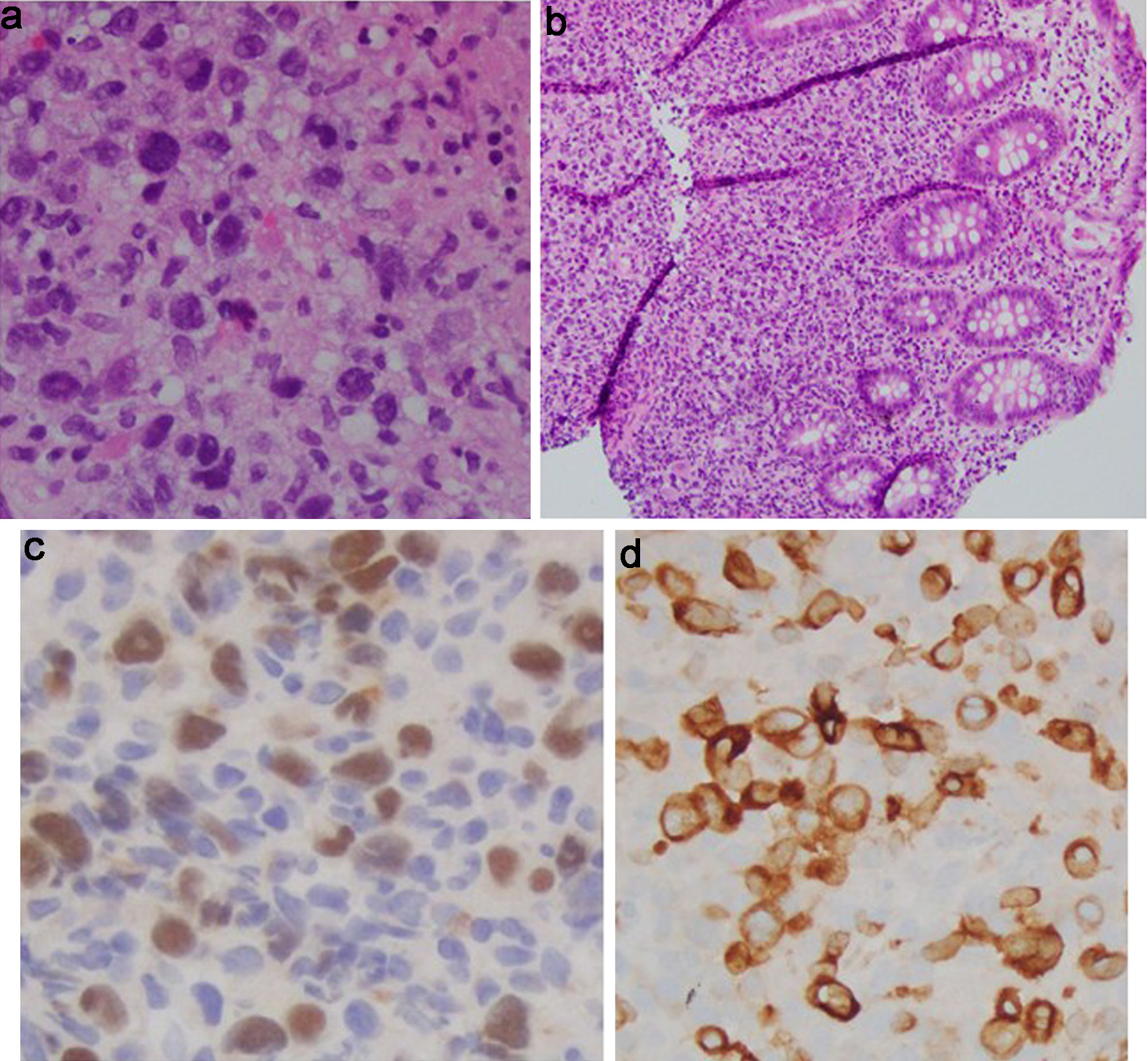 Due to the persistent abnormality noted on the PET scan, a repeat colonoscopy was performed. An infiltrative and ulcerated obstructing large mass was found in the cecum, measuring 14 mm, which was biopsied (Fig. 8a-c). There was an appearance of an ulcerated fistula in the rectum; biopsies were obtained (Fig. 8d). Both the cecal mass and rectal biopsies confirmed the diagnosis of recurrent DLBCL.