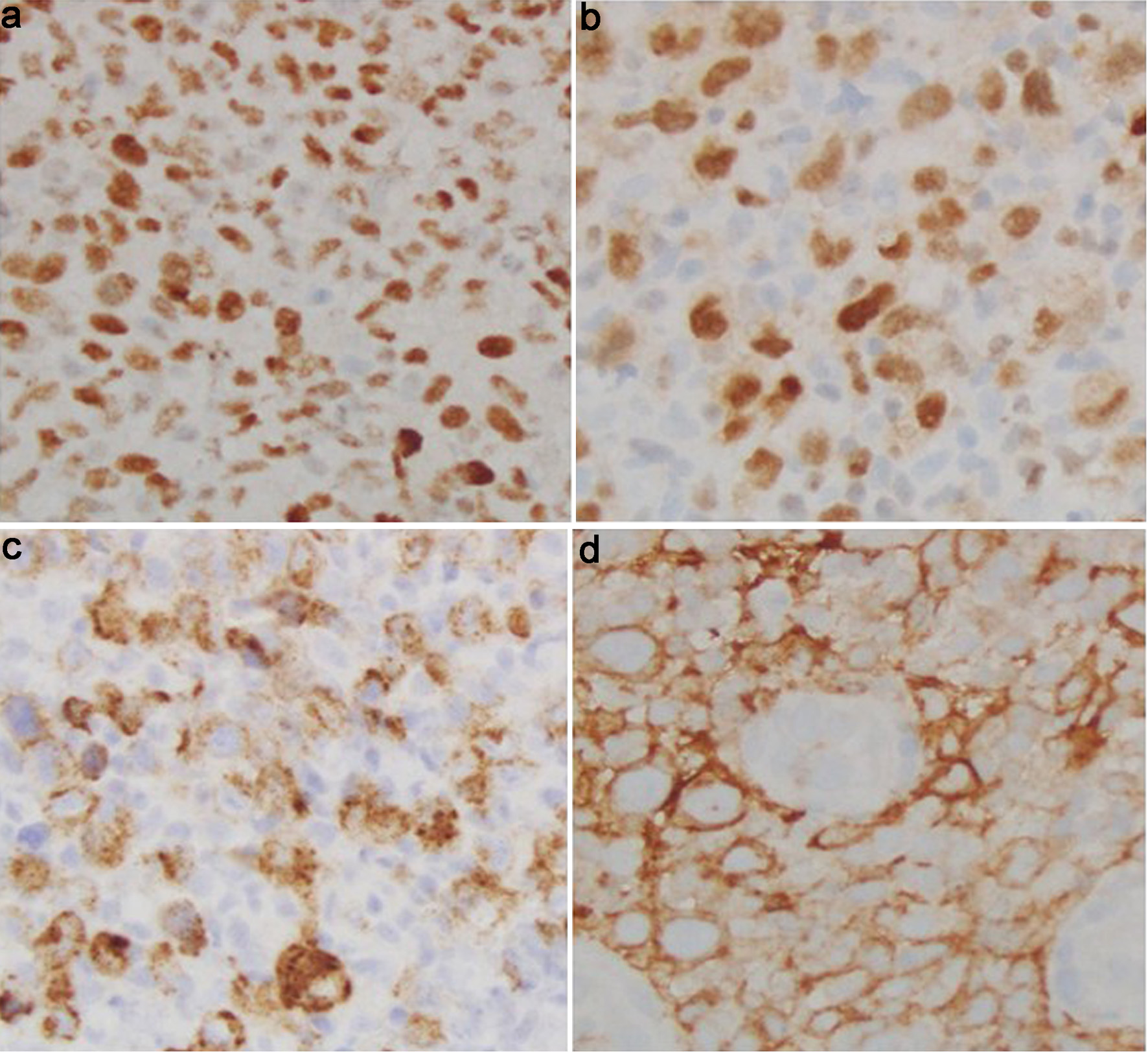 ![]() Click for large image | Figure 7. Cecal tumor histology. (a) BCL6 immunostain (× 40): positive in the neoplastic B cells. (b) MUM1 immunostain (× 40): positive in the neoplastic B cells. (c) EBV-LMP1 immunostain (× 40): positive in the neoplastic B cells. (d) CD10 immunostain (× 40): positive in the neoplastic B cells. BCL6: B-cell lymphoma 6; EBV-LMP1: Epstein-Barr virus latent membrane protein 1; MUM-1: multiple myeloma oncogene 1. |