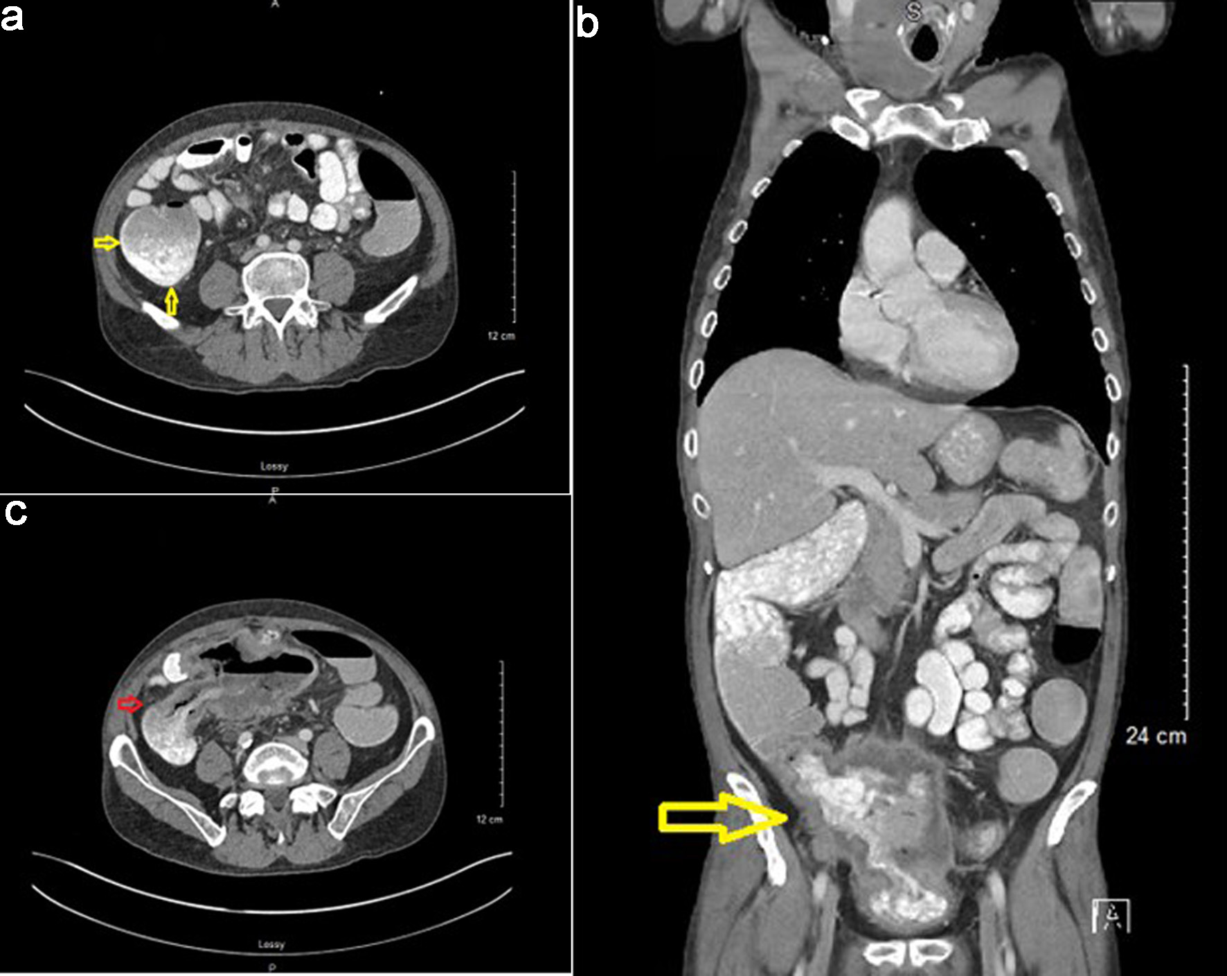 The patient was then hospitalized for severe diarrhea due to Clostridium difficile colitis and was treated with vancomycin. During this hospitalization, a CT scan of the abdomen with an oral and intravenous contrast was obtained. This revealed a markedly distended cecum with thick-walled changes (Fig. 9a), significant inflammatory stranding, and overt fistulization to the bladder. Dense oral contrast material was noted within the bladder (Fig. 9b, c). Unfortunately, due to the mass effect and colovesical fistula, the patient developed obstructive uropathy, necessitating the placement of a right-sided nephrostomy tube. He developed a urinary tract infection with E. coli as well, which was treated with antibiotics.