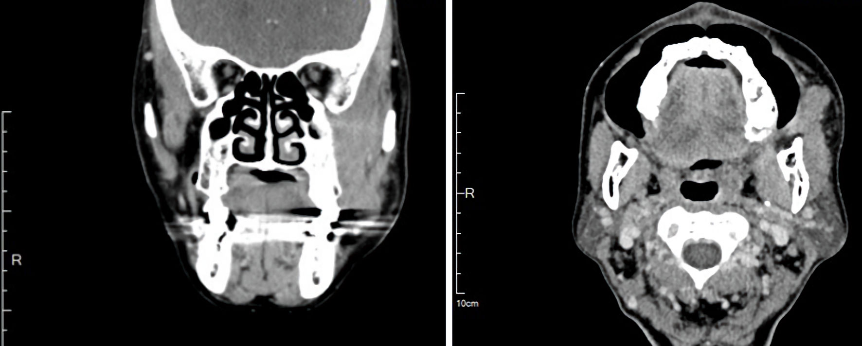 Contrast-enhanced computed tomography (CT) of the face revealed an infiltrative soft-tissue mass measuring 3.1 × 1.5 × 3.5 cm, centered in the left masticator space, with effacement of fat planes between the masseter, pterygoid, and temporalis muscles; there was no cortical erosion (Fig. 2). Given the deep-space location and infiltrative appearance, an intraoral incisional biopsy was performed under general anesthesia (Fig. 3).