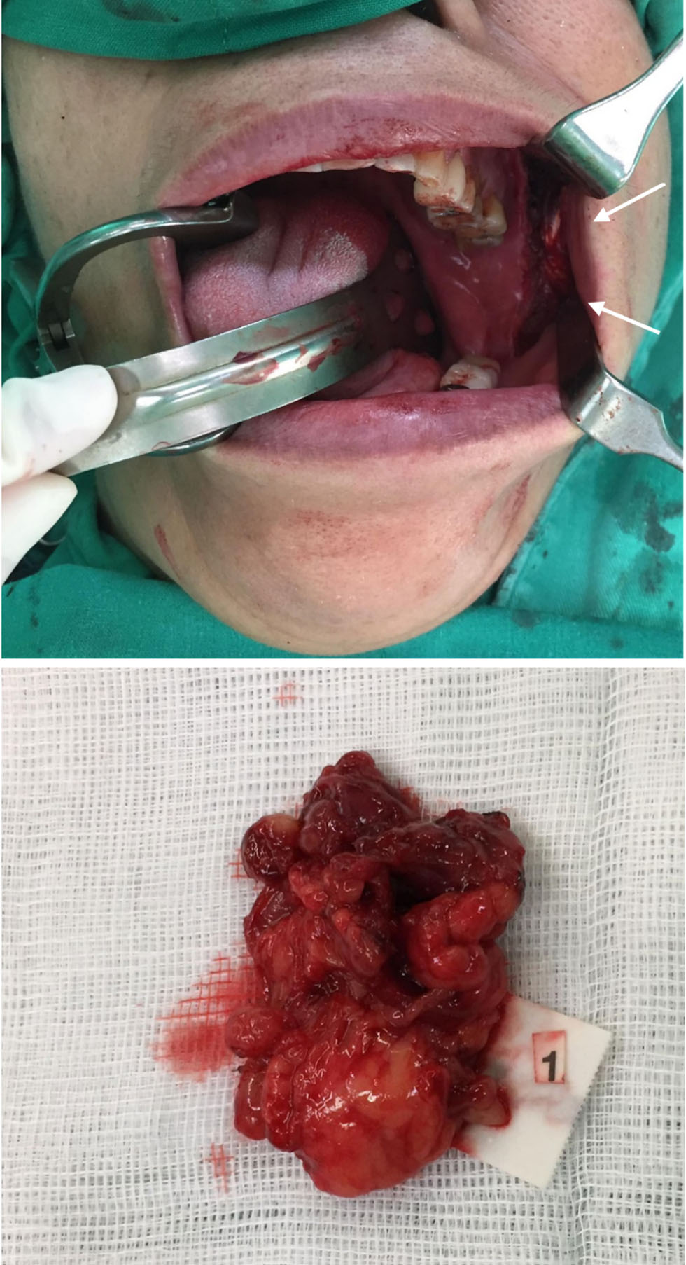 ![]() Click for large image | Figure 3. An intraoral incisional biopsy under general anesthesia with obtained specimen (arrows). The intraoral approach allowed direct access to the bucco-masseteric space while avoiding external scarring. |