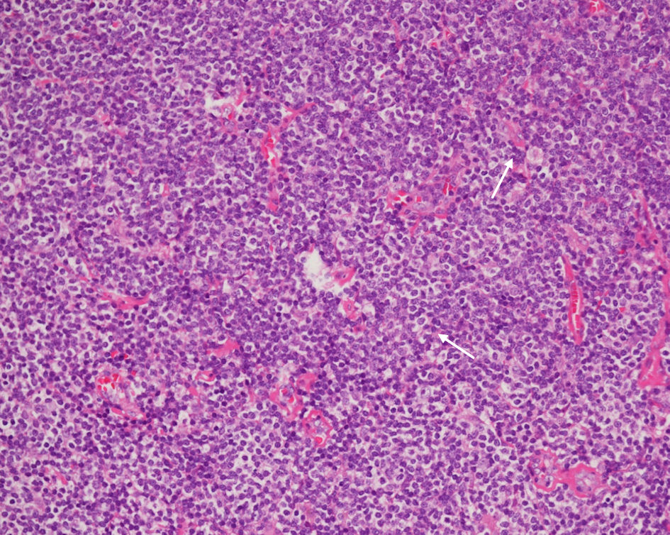 ![]() Click for large image | Figure 4. H&E stain (× 40) demonstrating a diffuse, vaguely nodular infiltrate, expanding the soft tissue and disrupting normal architectural boundaries. Note the presence of mild plasmacytic differentiation (arrows). H&E: hematoxylin and eosin. |