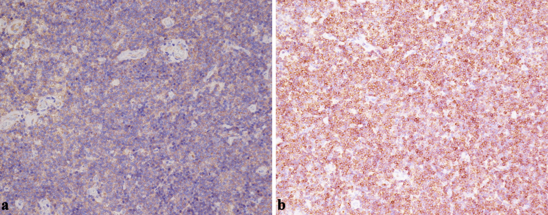 ![]() Click for large image | Figure 5. (a) Representative immunohistochemistry demonstrating diffuse CD20 positivity in the neoplastic B cells within the masticator-space lesion (× 200). (b) Bcl-2 staining highlights strong cytoplasmic expression in the small B cells, supporting a diagnosis of EMZL rather than reactive hyperplasia (× 200). EMZL: extranodal marginal zone B-cell lymphoma. |