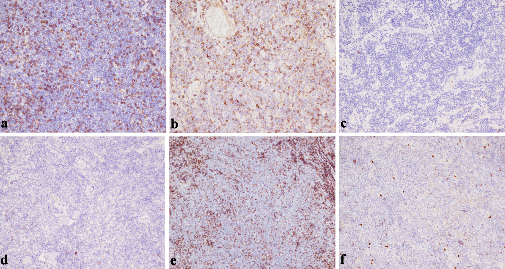 ![]() Click for large image | Figure 6. (a) CD3 negativity in the tumor cell population confirms that the predominant infiltrate is of B-cell rather than T-cell lineage (× 200). (b) Lack of CD5 expression helps to exclude mantle cell lymphoma and most chronic lymphocytic leukemia/small lymphocytic lymphoma (× 200). (c) The neoplastic lymphoid infiltrate is negative for CD10, supporting a marginal zone origin and helping exclude follicular lymphoma (× 200). (d) The neoplastic lymphoid population is negative for CD23 expression, helping distinguish this case from small lymphocytic lymphoma (× 200). (e) CD43 negativity in the neoplastic B cells is consistent with an EMZL phenotype and argues against other small B-cell lymphomas (× 200). (f) Bcl-6 negativity in the neoplastic lymphoid cells (× 200). This lack of Bcl-6 expression supports a post-germinal center origin and helps exclude follicular lymphoma. EMZL: extranodal marginal zone B-cell lymphoma. |