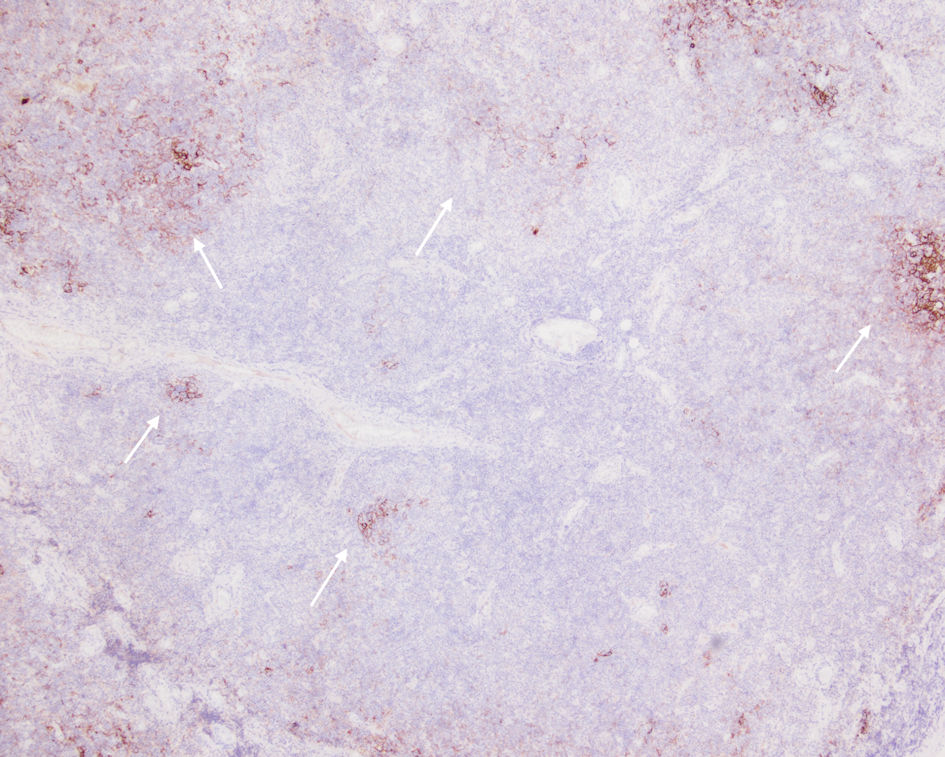 ![]() Click for large image | Figure 7. CD21 outlining disrupted follicular dendritic cell meshworks consistent with follicular colonization (arrows). |