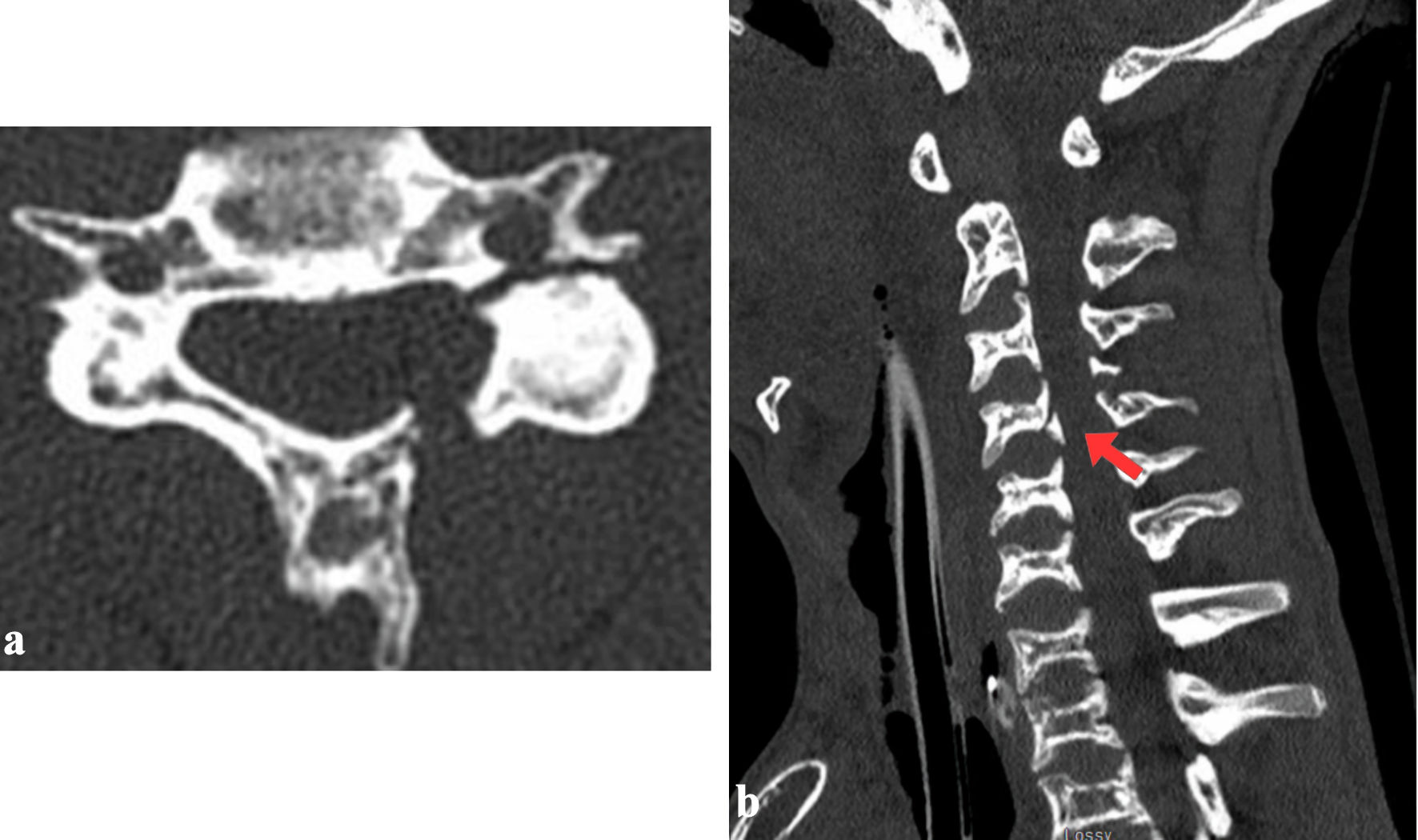![]() Click for large image | Figure 1. Axial (a) and sagittal (b) views of C4 vertebral body showing displaced fracture involving the posterior aspect of the C4 vertebral body and left lateral mass of C4, with involvement of the pedicle, lamina, transverse foramen and the superior and inferior articular facets. A nondisplaced fracture of the left inferior articular facet of C4 (red arrow) and pedicle of C6 (not shown) is also present. |
