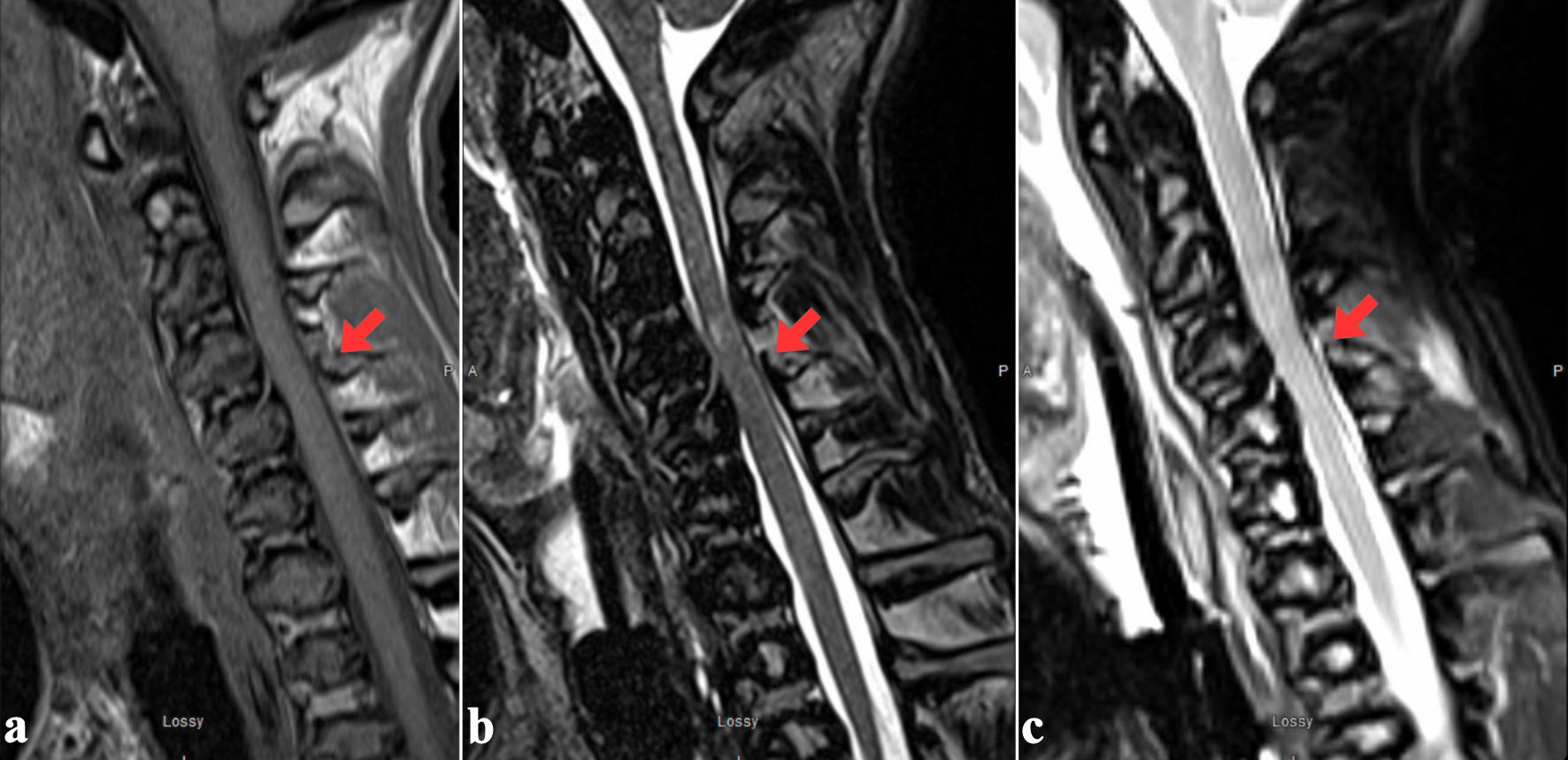 ![]() Click for large image | Figure 2. T1- (a), T2- (b) and STIR-weighted (c) magnetic resonance (MR) images showing mild spinal cord edema at the C3-C4 level and the left ventral aspect of the cord with thin posterior epidural hematoma. Posterior longitudinal ligament injury is seen at C4, with suspected ligamentum flavum injury at C3-C4. Interspinous ligamentous injury extends from C3 to C6 with left facet capsular injury from C3-C4 and C4-C5 (red arrows). STIR: short tau inversion recovery. |