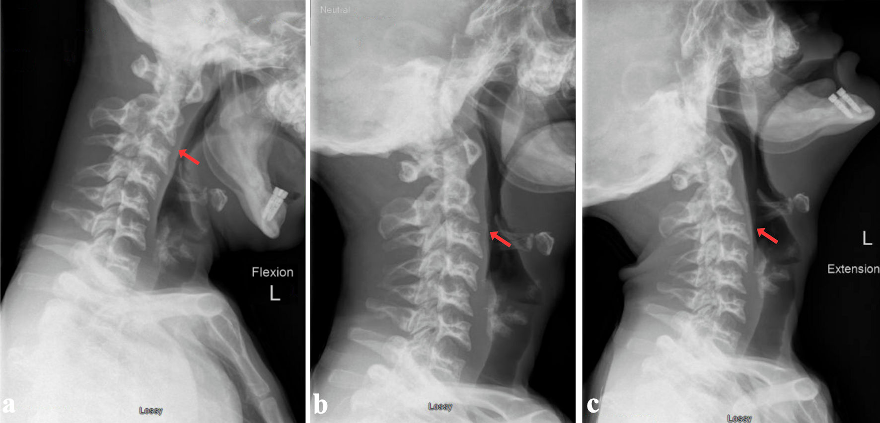 ![]() Click for large image | Figure 3. Radiographic follow-up at 1 year showing flexion (a), neutral (b) and extension (c) positions with no dynamic instability (red arrows). |