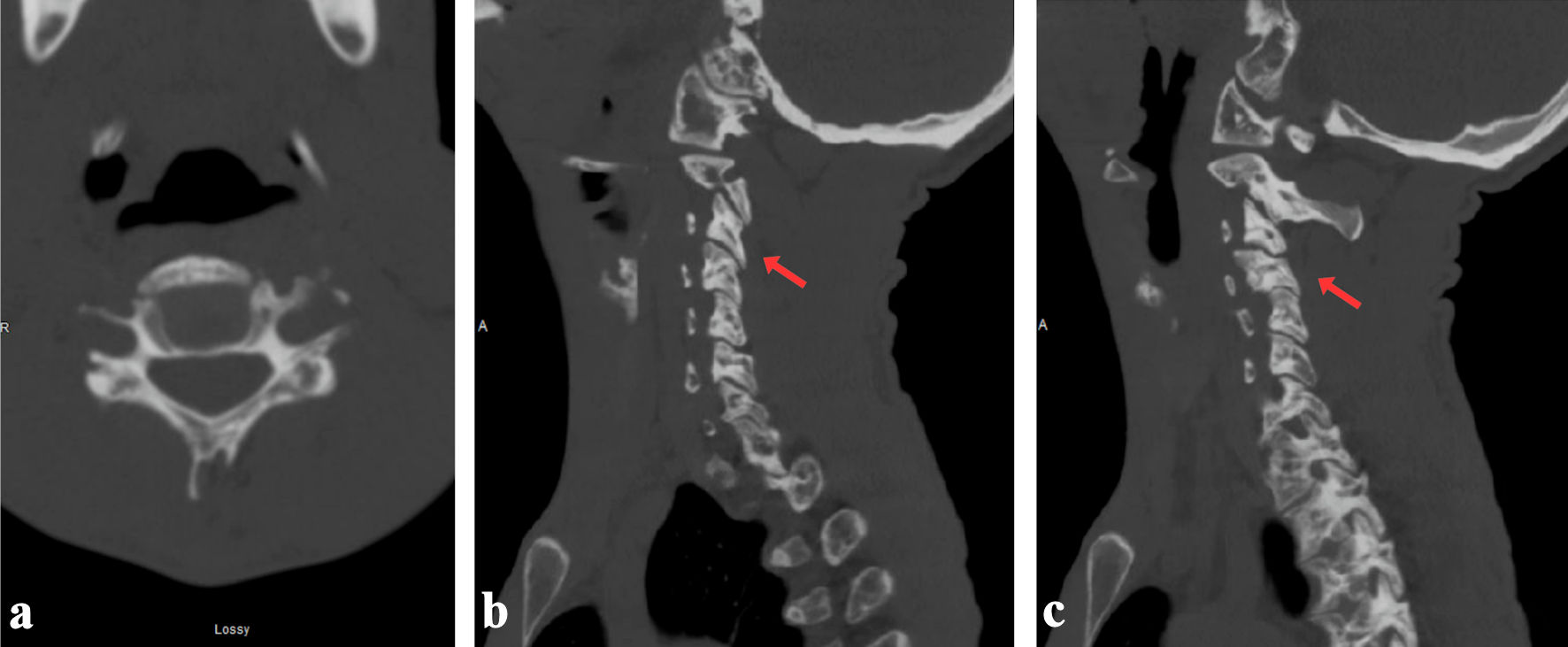 ![]() Click for large image | Figure 4. Final CT at 1-year follow-up demonstrating healed C4 fracture and lateral mass alignment in axial view (a), right (a) and left (c) side (red arrows). CT: computed tomography. |