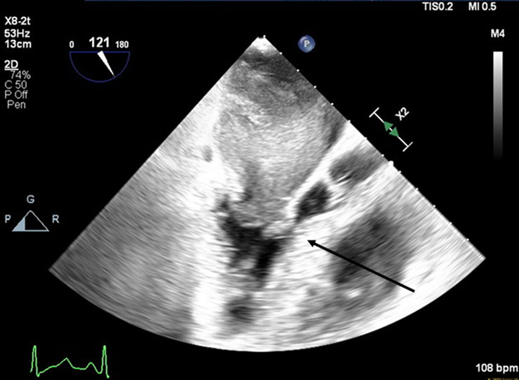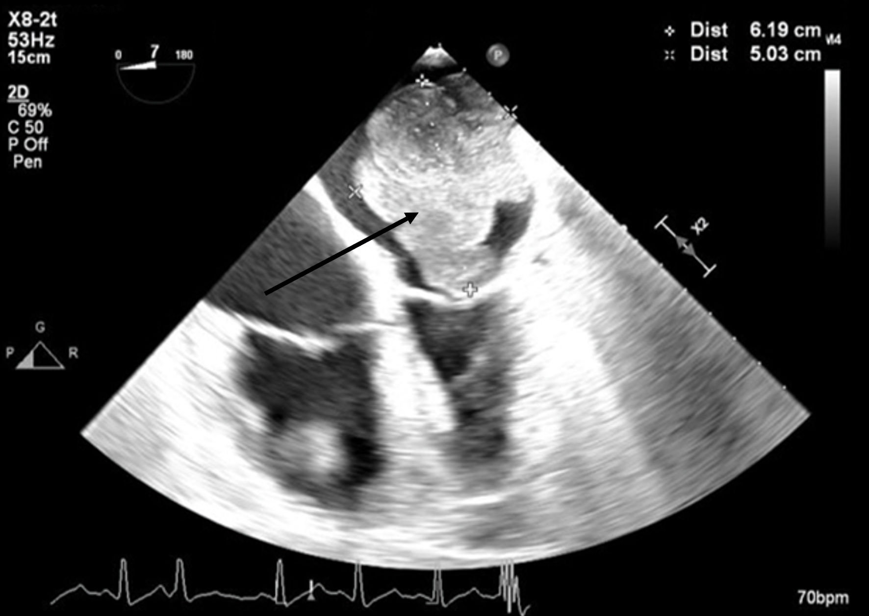 ![]() Click for large image | Figure 2. Mid-esophageal four-chamber view. A mass occupies the majority of the left atrium during systole. The arrow denotes the large cardiac tumor. |