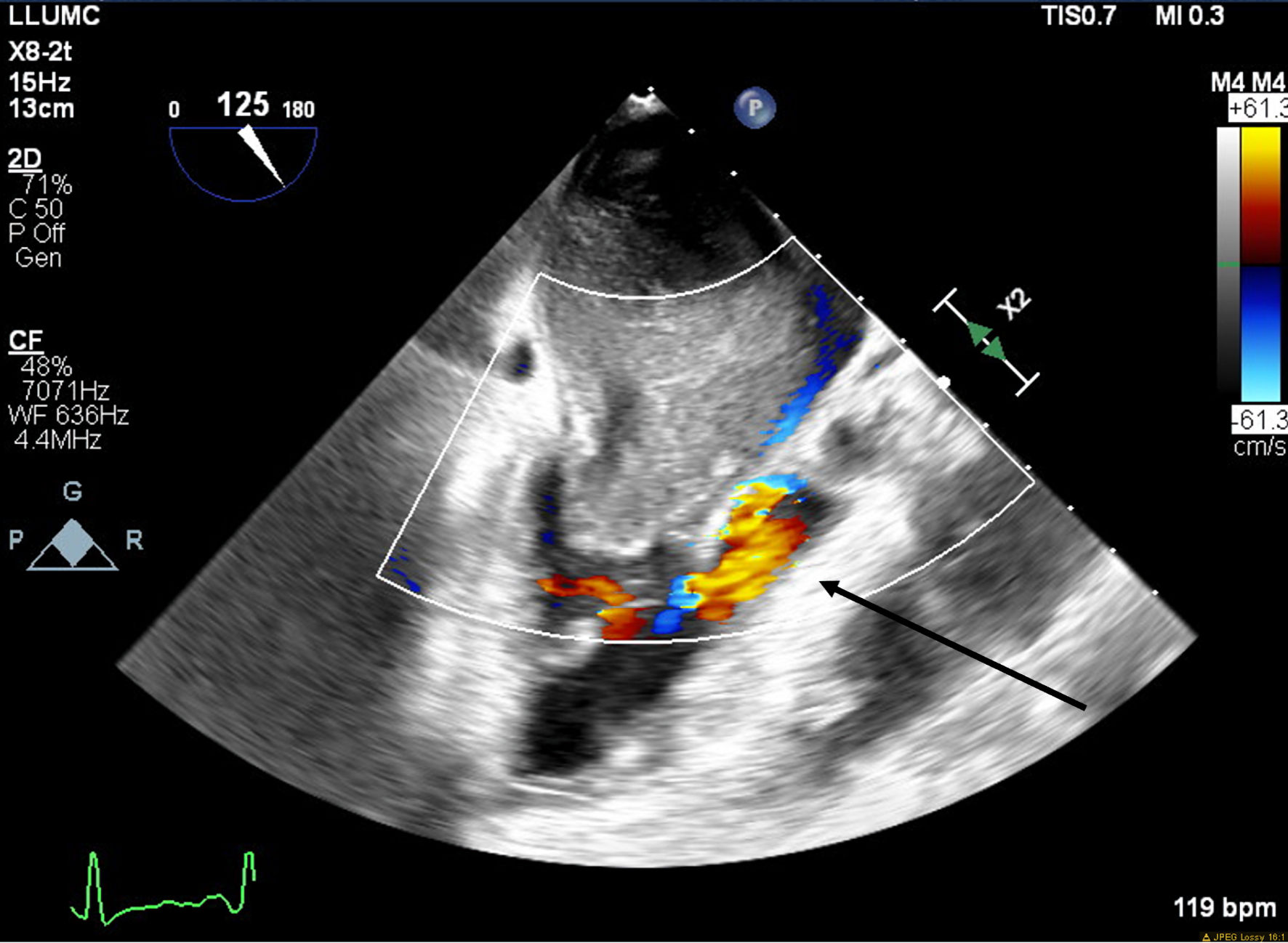 ![]() Click for large image | Figure 4. Mid-esophageal two-chamber view with color flow Doppler demonstrating turbulent flow around the mass through the mitral valve during diastole. The arrow indicates turbulent flow through the mitral valve. |