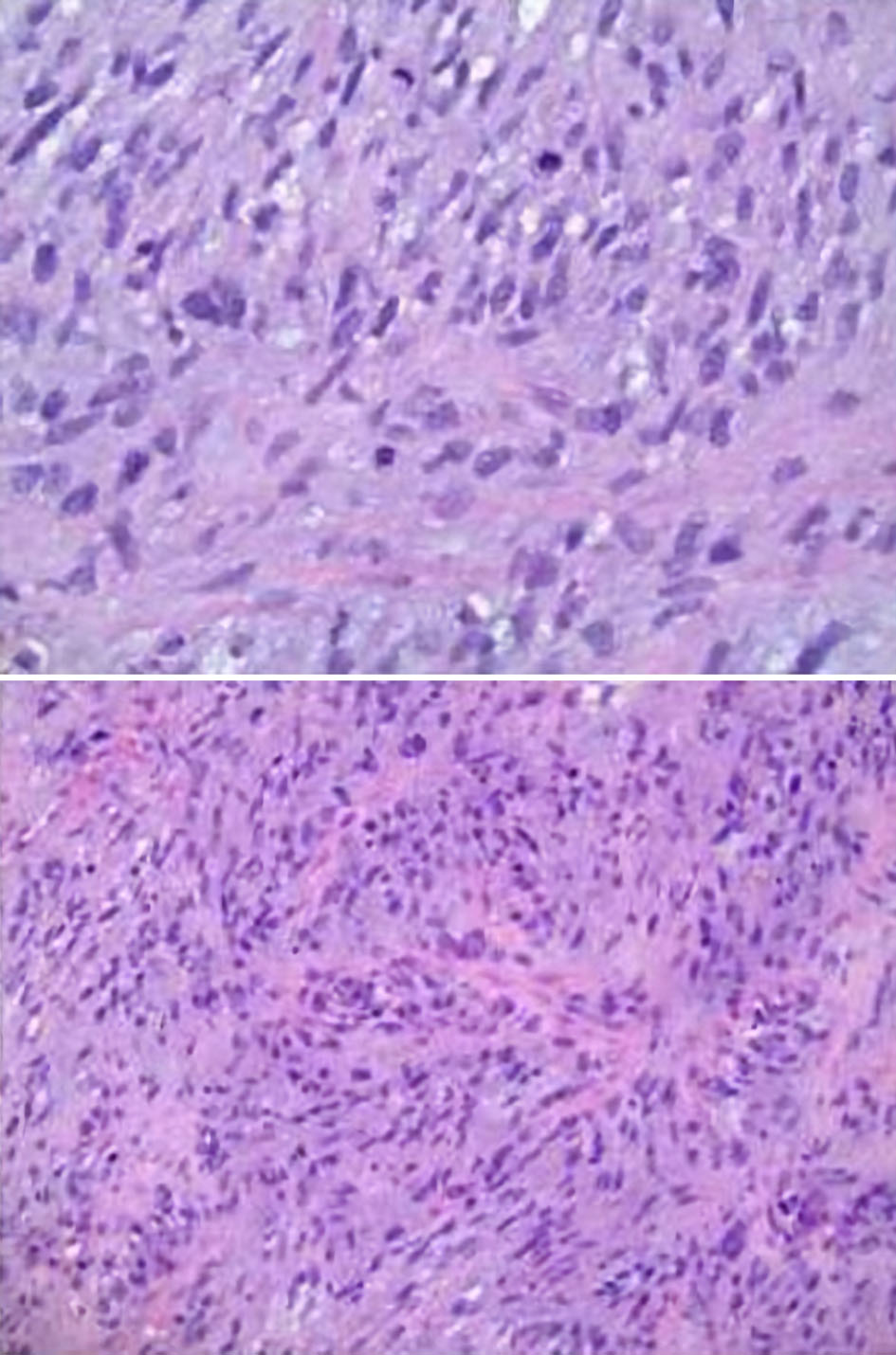 ![]() Click for large image | Figure 8. Microscopic pathology images demonstrating cardiac undifferentiated pleomorphic sarcoma (UPS), grade 3. The histology displays variable cellularity, with areas of marked pleomorphism, as well as foci of myxoid change and focal necrosis. Mitoses are easily identified in some areas and are scarce in others. These features support the interpretation of an UPS. |