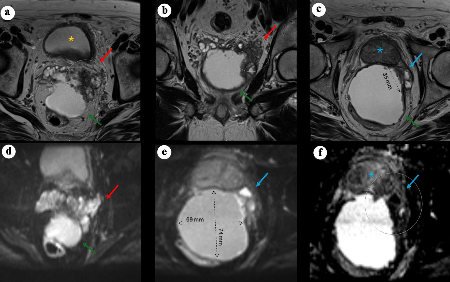 ![]() Click for large image | Figure 1. Pelvic MRI demonstrating a large cystic pelvic mass with features suggestive of malignancy. (a) Axial T2-weighted image showing a large, predominantly cystic mass (green arrow) situated between the rectum and the posterior left peripheral zone of the bladder (yellow asterisk), associated with a severely distorted left SV (red arrow) demonstrating hypoattenuation, suspected to originate from a left SV mass, with rim enhancement and peripheral nodularity (arrow). (b) Coronal view showing the mass located posteriorly and extending caudally. (c) Axial view demonstrating an additional smaller cystic focus (3.6 × 1.4 cm) between the left posterolateral mid-gland and the main lesion. Irregular T2-hypointense tissue extends between the left inferior SV, the cystic mass, and the left posterolateral base of the prostate, suspicious for malignancy (PI-RADS 5) with extraprostatic extension. (d) Axial DWI view of the mass. (e) Axial DWI showing marked diffusion restriction within the prostatic lesion and along the cyst lining (69 × 74 mm process). (f) Axial apparent diffusion coefficient (ADC) map demonstrating corresponding low signal. MRI: magnetic resonance imaging; PI-RADS: Prostate Imaging–Reporting and Data System; SV: seminal vesicle; DWI: diffusion-weighted imaging. |