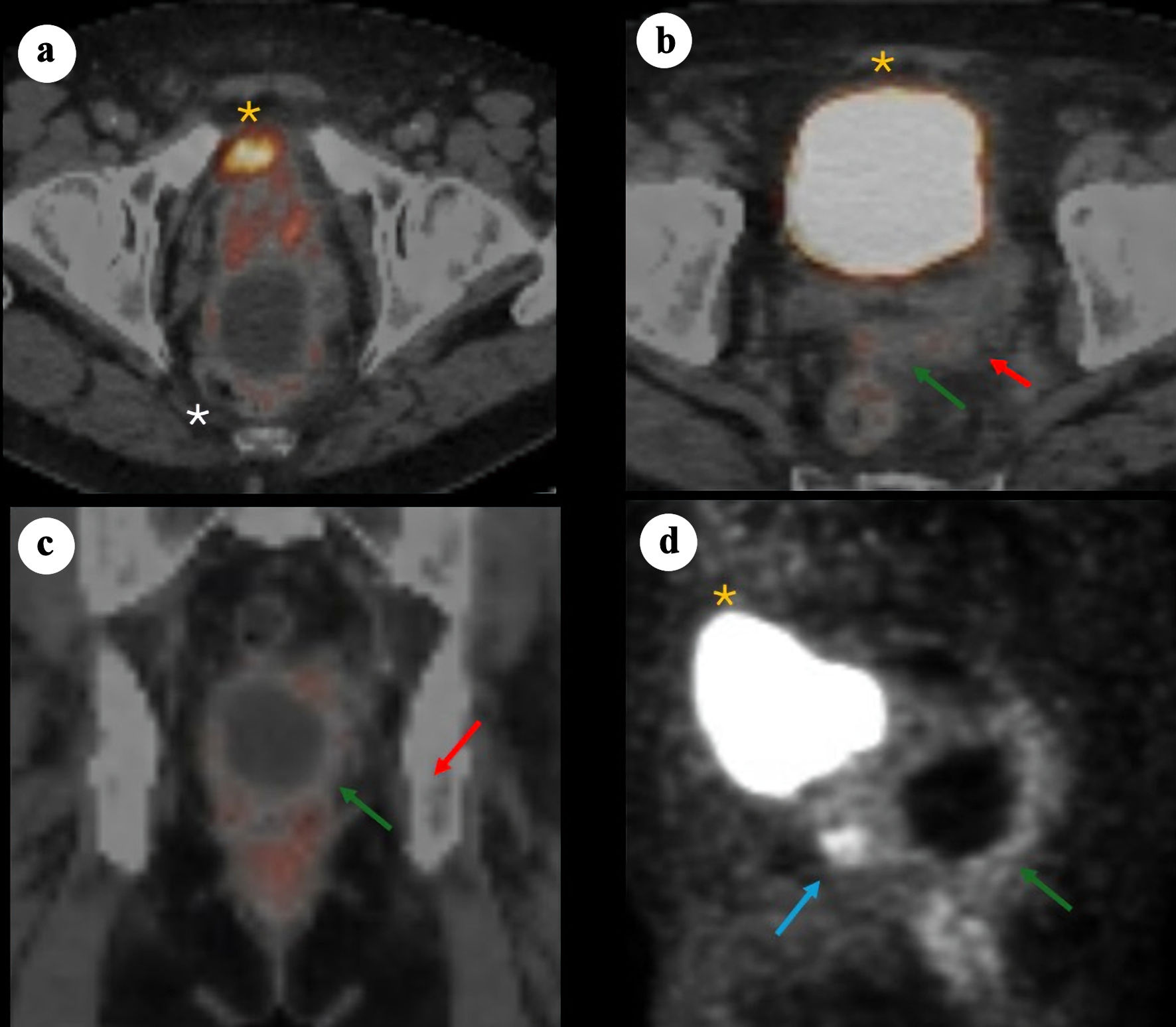 ![]() Click for large image | Figure 2. 68Ga-PSMA PET/CT images demonstrating a large cystic mass in the pelvis consistent with primary SV adenocarcinoma. (a) Axial PET/CT showing bladder anteriorly (yellow asterisk), prostate (minimal PSMA uptake) and adjacent cystic pelvic mass (white asterisk). (b) Axial PET/CT showing bladder anteriorly (yellow asterisk), with posterior a solid component (red arrow) arousing from the left SV and contiguous tissue extension (green arrow). (c) Coronal fused PET/CT showing the relationship between the cystic mass and the adjacent prostate/SV region, with the solid enhancing component (red arrow) and soft tissue extension (green arrow). (d) Sagittal PET maximum intensity projection illustrating the prostate solid lesion component (blue arrow) and cyst (green arrow) posterior and caudal to the bladder (yellow asterisk). PSMA: prostate-specific membrane antigen; PET/CT: positron emission tomography/computed tomography; SV: seminal vesicle. |