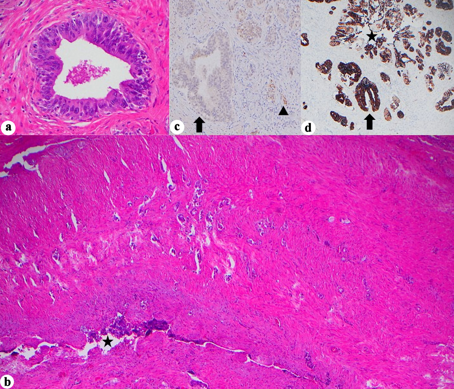 ![]() Click for large image | Figure 3. Histopathologic and immunohistochemical features of seminal vesicle involvement. (a) Marked cellular atypia arising in continuity with SV lumen, assumed to be in situ component, (H&E, × 400). (b) Glandular infiltration into SV wall (H&E, × 40, star = SV lumen). (c) PAX8 negativity in the in situ component but retained in normal SV epithelium (× 400, arrow = in situ glands, arrowhead = normal SV). (d) CK7 positivity in the in situ component and normal SV glands (× 40, star = SV lumen, arrow = in situ glands). H&E: hematoxylin and eosin stain; SV: seminal vesicle; CK: cytokeratin; PAX8: paired box gene 8. |