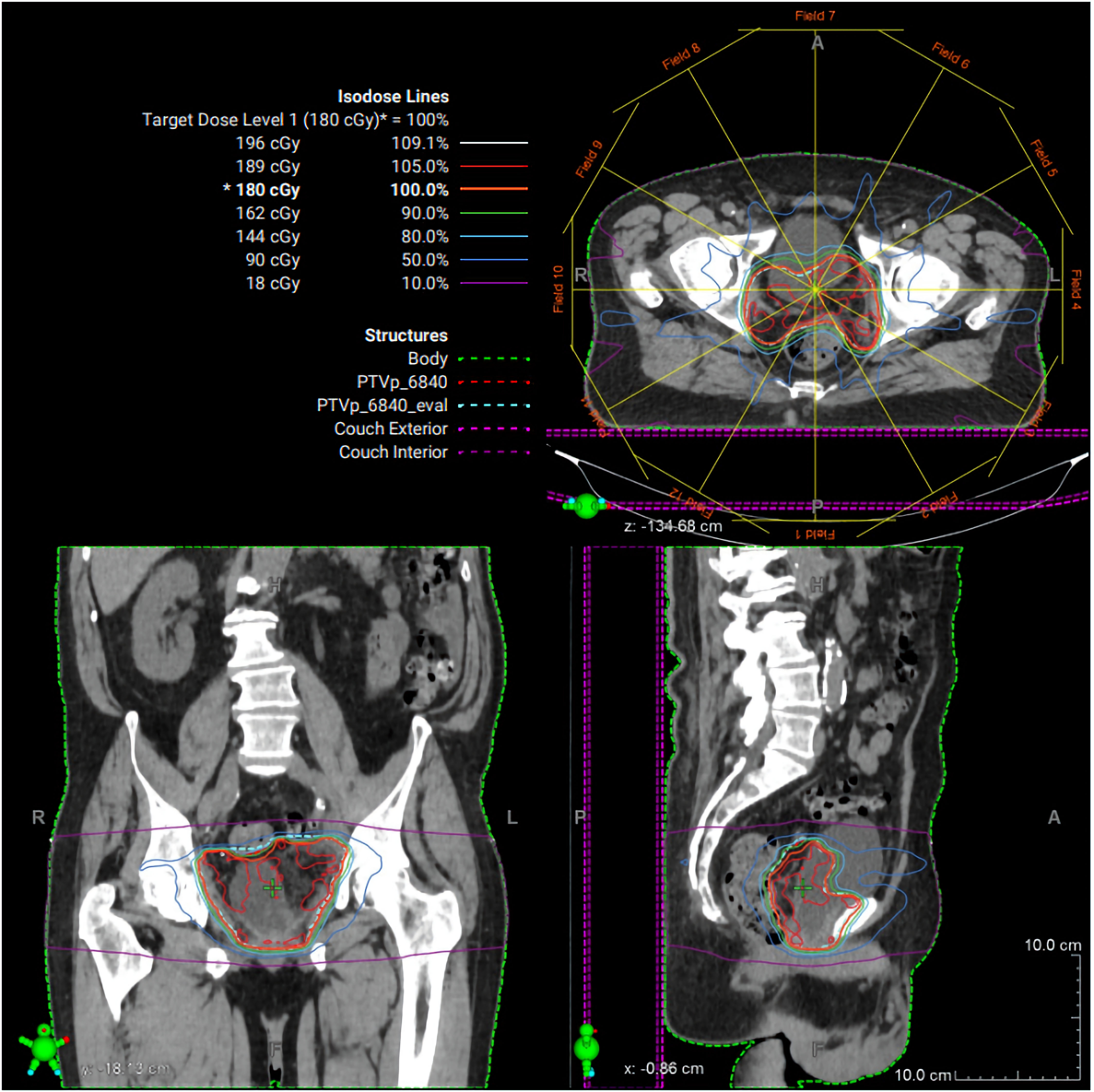 ![]() Click for large image | Figure 4. Radiation therapy treatment plan. Representative intensity-modulated radiation therapy (IMRT) plan demonstrating axial, coronal, and sagittal dose distributions for the pelvic target volume. Isodose lines represent percentage dose levels relative to the prescribed 180 cGy fraction. The planning target volume is shown in green, with color-coded isodose curves illustrating conformal coverage of the target and sparing of surrounding normal tissues. |