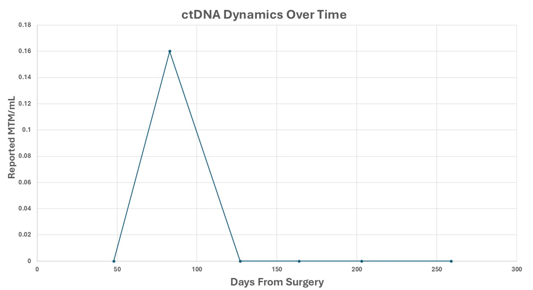![]() Click for large image | Figure 5. ctDNA dynamics over time. Reported ctDNA levels were measured as MTM/mL, following surgical resection. Each point represents a postoperative plasma sample collected at the indicated time (days from surgery). A transient ctDNA peak was observed at approximately 70 days, followed by sustained clearance thereafter. ctDNA: circulating tumor DNA; MTM/mL: mean tumor molecules per milliliter. |