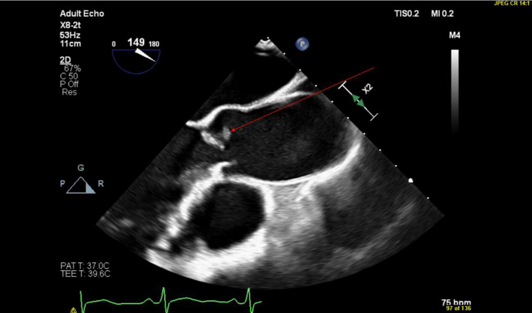 ![]() Click for large image | Figure 1. TEE showing a parasternal long axis view of the aortic valve with the papillary fibroelastoma indicated by the red arrow. TEE: transesophageal echocardiogram. |