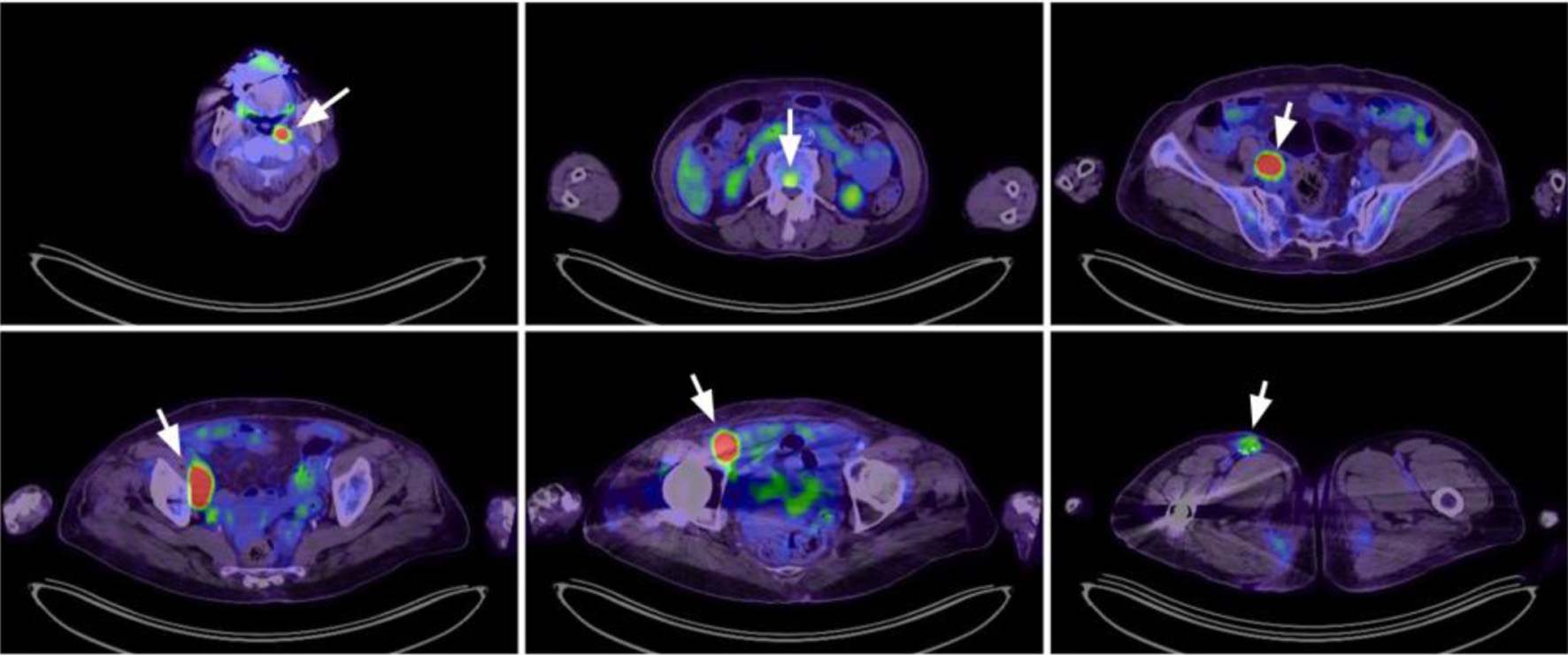 A 79-year-old Asian woman was initially presented with an enlarging right femoral mass for 2 months. An excisional biopsy confirmed the diagnosis of DLBCL, with immunohistochemical expression of MUM-1, BCL-6, BCL-2, and c-MYC. A positron emission tomography (PET) scan revealed stage IV disease with multiple bone involvements (Fig. 1). Bone marrow study revealed 0.1% of clonal B cells that expressed CD19, CD20, and surface kappa light chain. Based on her age, extranodal involvement, and stage IV disease, her revised International Prognostic Index (R-IPI) was 3.