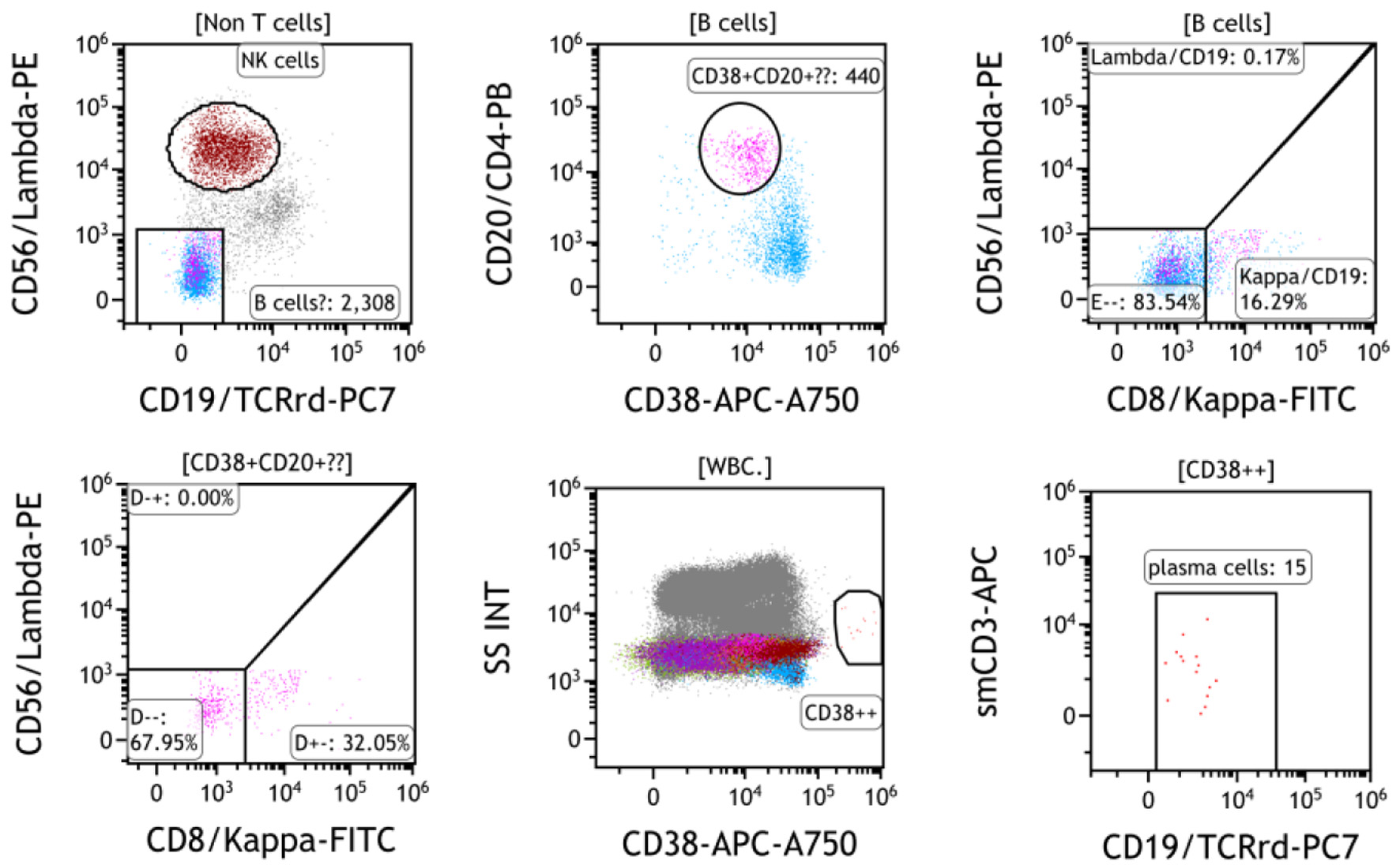 ![]() Click for large image | Figure 2. Bone marrow flow cytometry at cycle 10 day 6 of tafasitamab plus lenalidomide showed a small population of CD19-negative B cells (purple, 440 events, 0.16%) expressing CD20 and surface kappa light chain. Plasma cells are nearly depleted (15 events, 0.01% of marrow cells). |