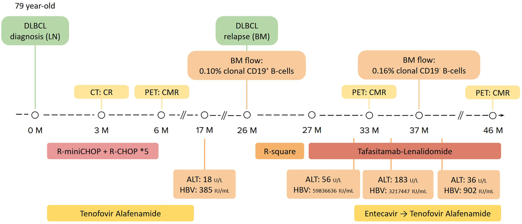After four cycles of tafasitamab plus lenalidomide without HBV prophylaxis, this patient developed hypogammaglobulinemia, with a serum IgG concentration of 576 mg/dL. Her alanine aminotransferase (ALT) mildly increased to 56 U/L, with serum HBV viral load increased from 32 IU/mL at DLBCL relapse to 59,836,636 IU/mL. History taking and reviewing her medications did not reveal a possible cause of her abnormal ALT level other than HBV infection. Out-of-pocket preemptive entecavir was prescribed for HBV reactivation. One month later, her ALT further increased to 183 U/L, but her serum HBV viral load dropped to 3,217,447 IU/mL. Serum total bilirubin levels were normal during this period, compatible with a diagnosis of HBV reactivation without hepatic decompensation. Under continued HBV treatment, her ALT and HBV viral load then gradually improved. The whole treatment course was summarized in Figure 3.